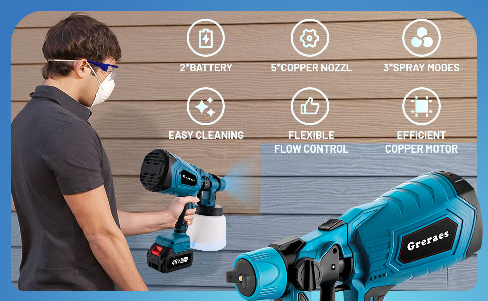 La Pistola de Pintura con 2 baterías de 48V es la herramienta ideal para trabajos en el hogar, vehículos, muebles, paredes y más. Olvídate de los cables y gana libertad de movimiento para pintar donde sea.